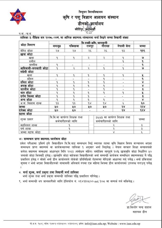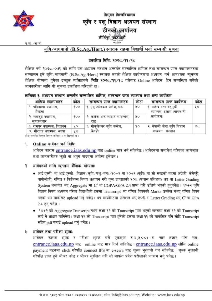 काठमाडौं/१९ फागुन-त्रिभुवन विश्वविद्यालय कृषि र पशु विज्ञान अध्ययन संस्थान डीनको कार्यालयले कृषि/वागवानी स्नातक तहमा नयाँ भर्नाका लागि आवेदन माग गरेको छ । शैक्षिक सत्र २०७८/०७९ को लागि कृषि/वागवानी स्नातक तहको शैक्षिक कार्यक्रममा अध्ययन गर्न आवश्यक न्युनतम शैक्षिक योग्यता पुगेका इच्छुक व्याक्तिहरुसँग आवेदन माग गरीएको हो ।
