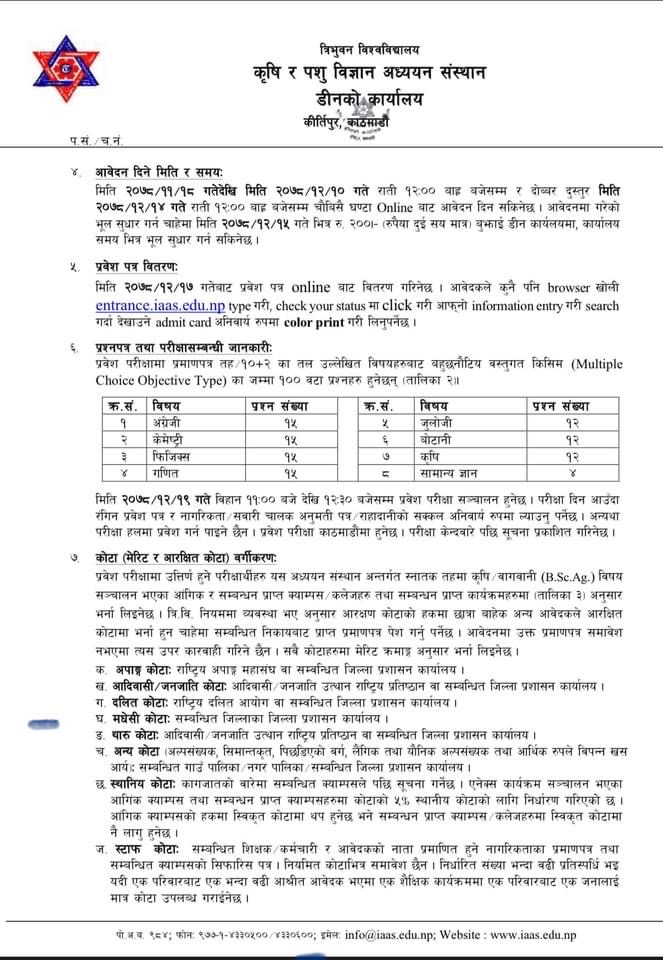 इच्छुक व्याक्तिहरुले फागुन १८ गतेदेखि चेत १० गतेसम्म नियमित शुल्क र चेत १४ गतेसम्म देब्बर शुल्कमा अनलाइनबाटै आवेदन फाराम भर्न सकिने विश्वविद्यालयले जनाएको छ ।