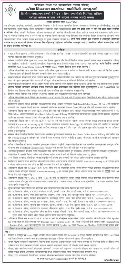 विभिन्न् कार्यक्रमहरुको दोस्रो वर्ष दोस्रो खण्ड र तेस्रो वर्ष दोस्रो खण्ड नियमित र आंशिक परीक्षा आगामि चेत÷वैशाखमा सञ्चालन हुने भएकाले परीक्षार्थीहरुलाई परीक्षा आवेदन फाराम भरी बुझाउन भनिएको हो ।