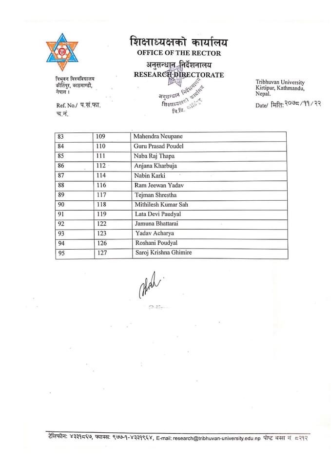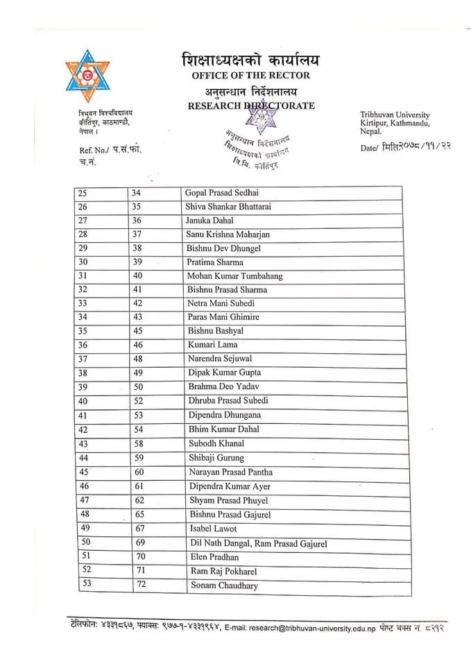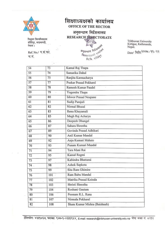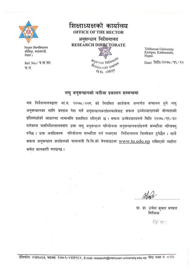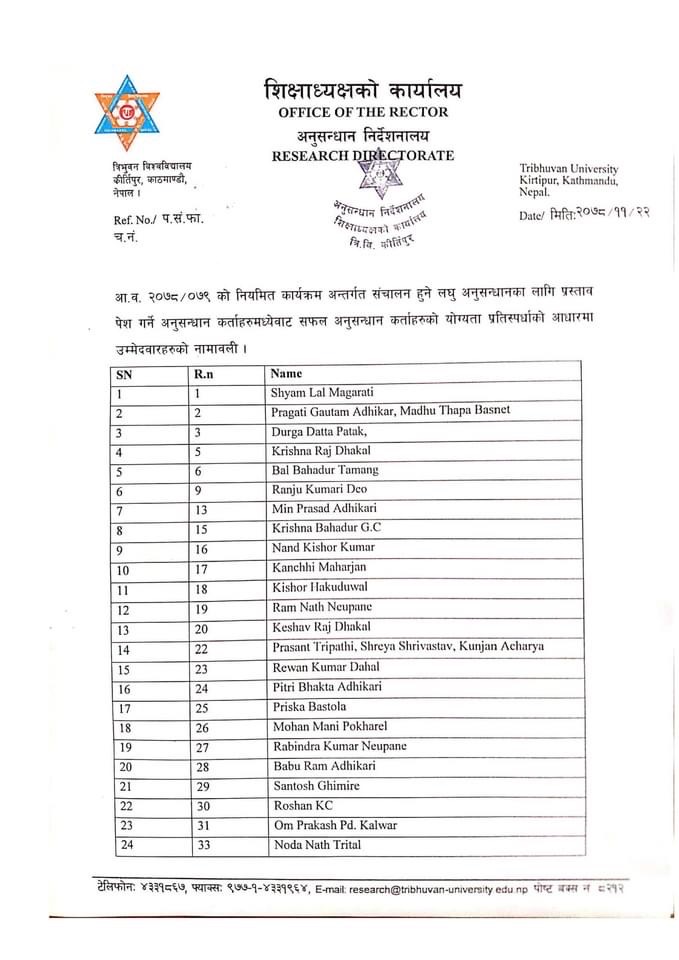काठमाडौं/२२ फागुन-त्रिभुवन विश्वविद्यालय शिक्षाध्यक्षको कार्यालय, अनुसन्धान निर्देशनालयले लघु अनुसन्धानको नतीजा प्रकाशन गरेको छ । लघु अनुसन्धानका लागि प्रस्ताव पेश गर्ने अनुसन्धानकर्ताहरु मध्येबाट सफल उम्मेदवारहरुको योग्यताको प्रतिस्पर्धाका आधारमा नामावली प्रकाशित गरीएको हो ।