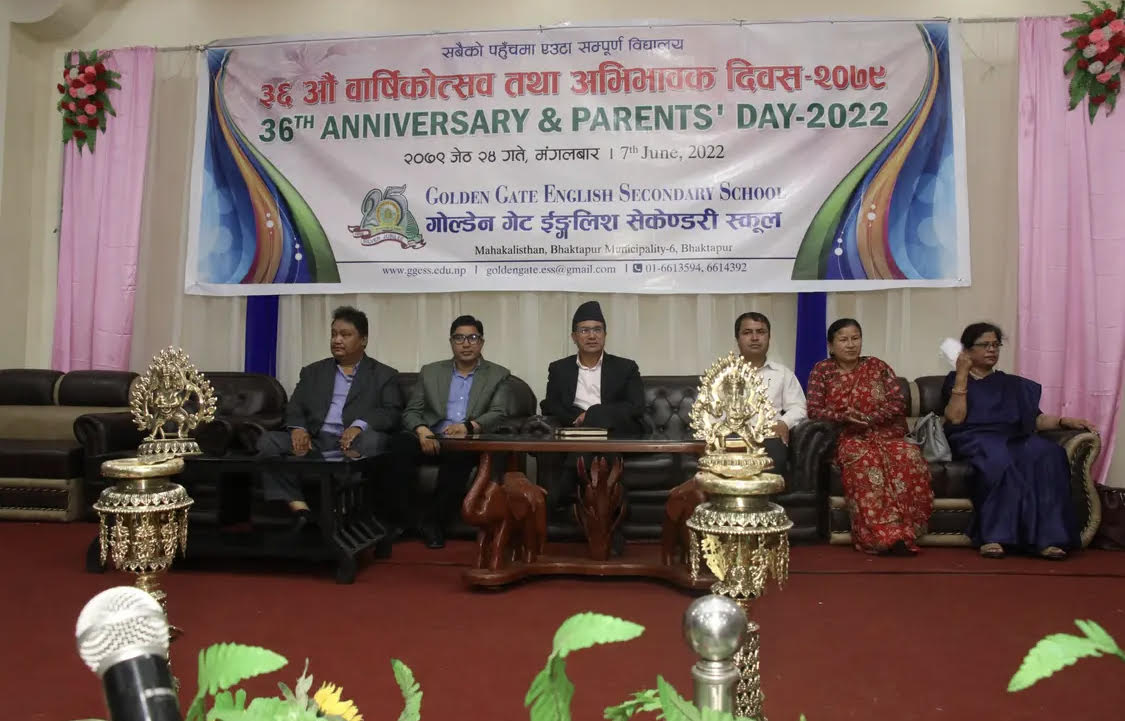 भक्तपुर/२५ जेठ-भक्तपुर नगरपालिकाका नव निर्वाचित नगर प्रमुख सुनिल प्रजापतिको प्रमुख आतिथ्यमा महाकालि स्थान, भक्तपुर स्थित गोल्डेन गेट ईङ्ग्लिश सेकेण्डरी स्कूलले ३६औं वार्षिकोत्सव तथा अभिभावक दिवस मनाएको छ । जेष्ठ २४ गते मंगलवार अभिभावक, विद्यार्थी, विद्यालय कर्मचारी तथा नव निर्वाचित जनप्रतिनिधीहरु विच ३६औं वार्षिकोत्सव तथा अभिभावक दिवस मनाएको छ ।
