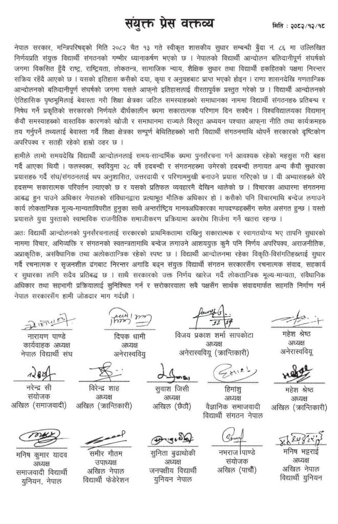 शिक्षा क्षेत्रका सम्पूर्ण बेथितिहरूको भारी विद्यार्थी संगठनमाथि थोपर्ने सरकारी दृष्टिकोण सतही रहेको उनीहरूको उल्लेख गर्दै मन्त्रिपरिषद्को गत चैत १३ गतेको निर्णय (शासकीय सुधारसम्बन्धी कार्यसूचीको बुँदा नं. ८६ अविलम्ब खारेज गर्न माग गरेका छन् ।