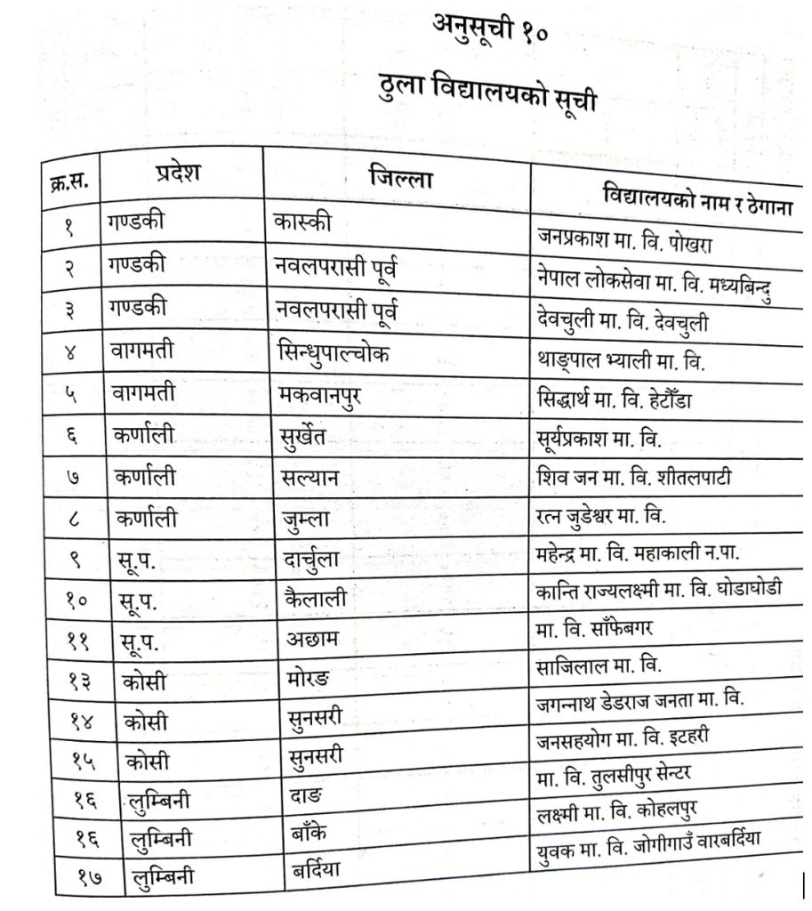 शिक्षा तथा मानव स्रोत विकास केन्द्र सानोठिमीद्वारा प्रकाशित आर्थिक वर्ष २०८२/८३ का लागि स्थानीय र प्रदेश तहबाट कार्यान्वयन हुने ससर्त अनुदान अन्तर्गतका कार्यक्रम एवम् शिक्षा विकास तथा समन्वय इकाइबाट कार्यान्वयन हुने कार्यक्रमको कार्यान्वयन विधिको पेज नं १४१ को अनुसूची १० मा ठुला विद्यालयको सूची उल्लेख गरिएको छ । यस सूचीमा देशका मधेश प्रदेश बाहेकका ६ प्रदेशका (वागमती प्रदेशका दुई र बाँकी ५ प्रदेशका ३/३ वटा गरी) १७ वटा विद्यालयहरूको नाम छ । यी विद्यालयहरू हिमाली क्षेत्रबाट जुम्लामा एउटा, पहाडी क्षेत्रमा ७ वटा र बाँकी तराइ क्षेत्रमा रहेका छन् ।
