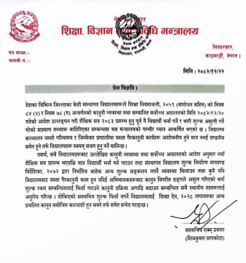 साथै मन्त्रालयले कुनै पनि विद्यालयबाट यस्ता गैरकानुनी काम हुन नदिई अभिभावहरूबाट कानुनविपरीत ढंगले असुल गरिएको भर्ना शुल्क रकम सम्बन्धितलाई फिर्ता गराउने कानुनी प्रक्रिया अगाडि बढाउन सम्बन्धित सबै स्थानीय तहहरूलाई विज्ञप्ति मार्फत अनुरोध गरेको छ ।