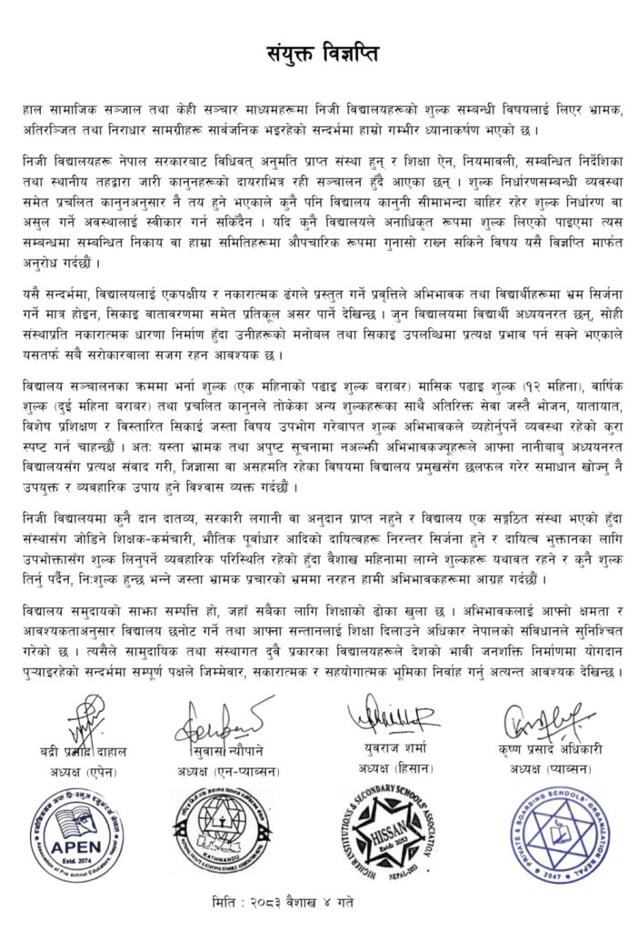 विभिन्न निजी विद्यालयसम्बद्ध सङ्घसंस्थाले संयुक्त विज्ञप्ति जारी गर्दै निजी विद्यालयहरू नेपाल सरकारबाट स्वीकृति प्राप्त संस्था भएको र शिक्षा ऐन, नियमावली तथा सम्बन्धित निर्देशकअनुसार सञ्चालन हुँदै आएको उल्लेख गर्दै शुल्क निर्धारणसम्बन्धी प्रचलित कानुनी व्यवस्था र मापदण्डअनुसार नै विद्यालयले सेवा प्रवाह गर्दै आएको जनाएका हुन् ।