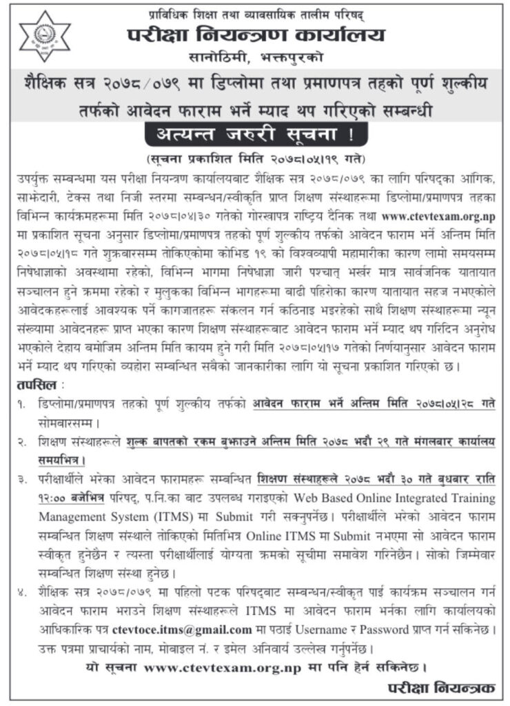 काठमाडौं/१९ भदौ-सिटिइभिटि परीक्षा नियन्त्रण कार्यलयले शैक्षिक सत्र २०७८ /०७९ मा डिप्लोमा तथा प्रमाणपत्र तहको पूर्ण शुल्कीय तर्फको अवेदन फारम भर्ने सामय थप गरेको छ । शिक्षण संस्थाहरुमा न्यून संख्यामा आवेदन प्राप्त भएका कारण शिक्षण संस्थाहरुबाट आवेदन फारम भर्ने समय थपगरिदिन आग्रह गरेका कारण समय थप गरिएको हो ।